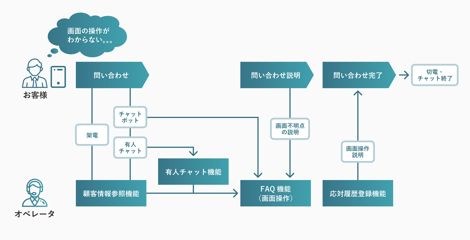 顧客が「画面の操作方法がわからない」となった際、企業へ電話での問い合わせが入ります。 顧客が本当に困っているのになかなか電話が繋がらないや、繋がってもたらい回しにされてしまうという課題が多くあります。 なるべく待たせないように、企業側でチャットやチャットボットを窓口としてチャネルを用意することや、 顧客が求める質問に対して回答できるオペレータへ電話を繋げるといったシステム作りが必要です。 同じ顧客から何度も電話がかかってくることもあるため、顧客の行動を理解して応対する機能が必要です。